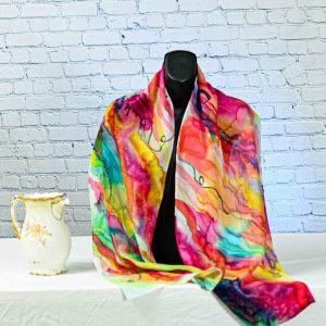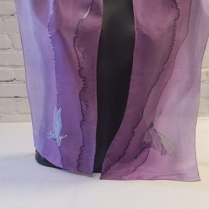 HAND PAINTED HABOTAI SILK SCARF PAINTED WITH FRENCH SILK DYES Dark Orchidee Purple flowers are painted on a Magenta and white background for a stunning, dramatic look to this luxurious silk scarf. The rich purple border adds an elegant balance.