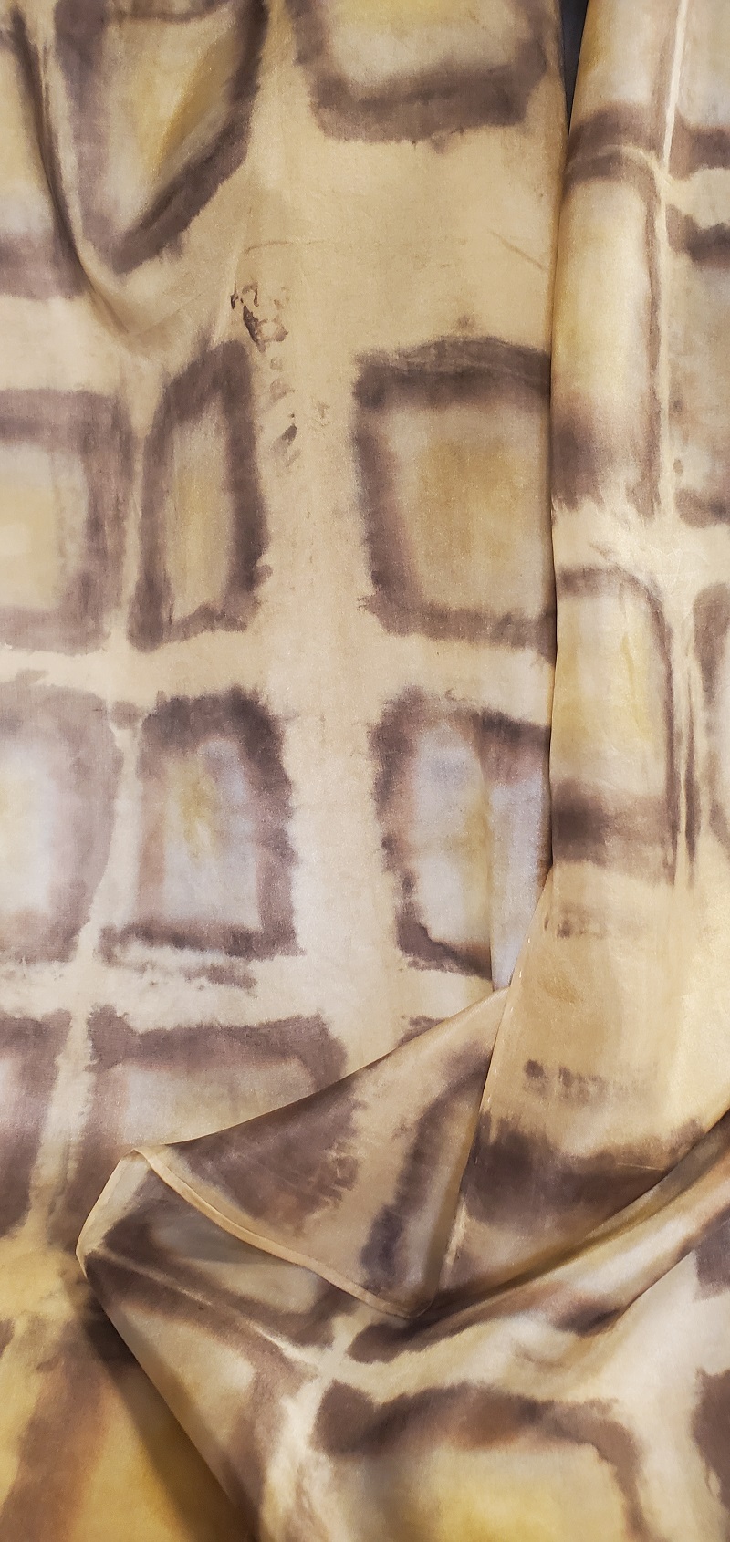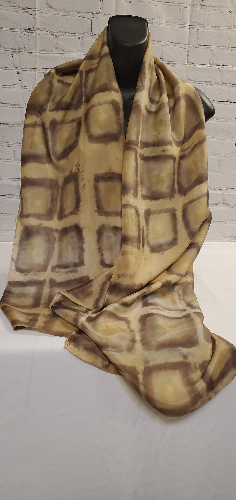 HAND PAINTED HABOTAI SILK SCARF SHIBORI is the Japanese dying technique that has been used on this silk painting, using French Silk Dyes. Immerse yourself in the warm glow of this golden silk scarf.