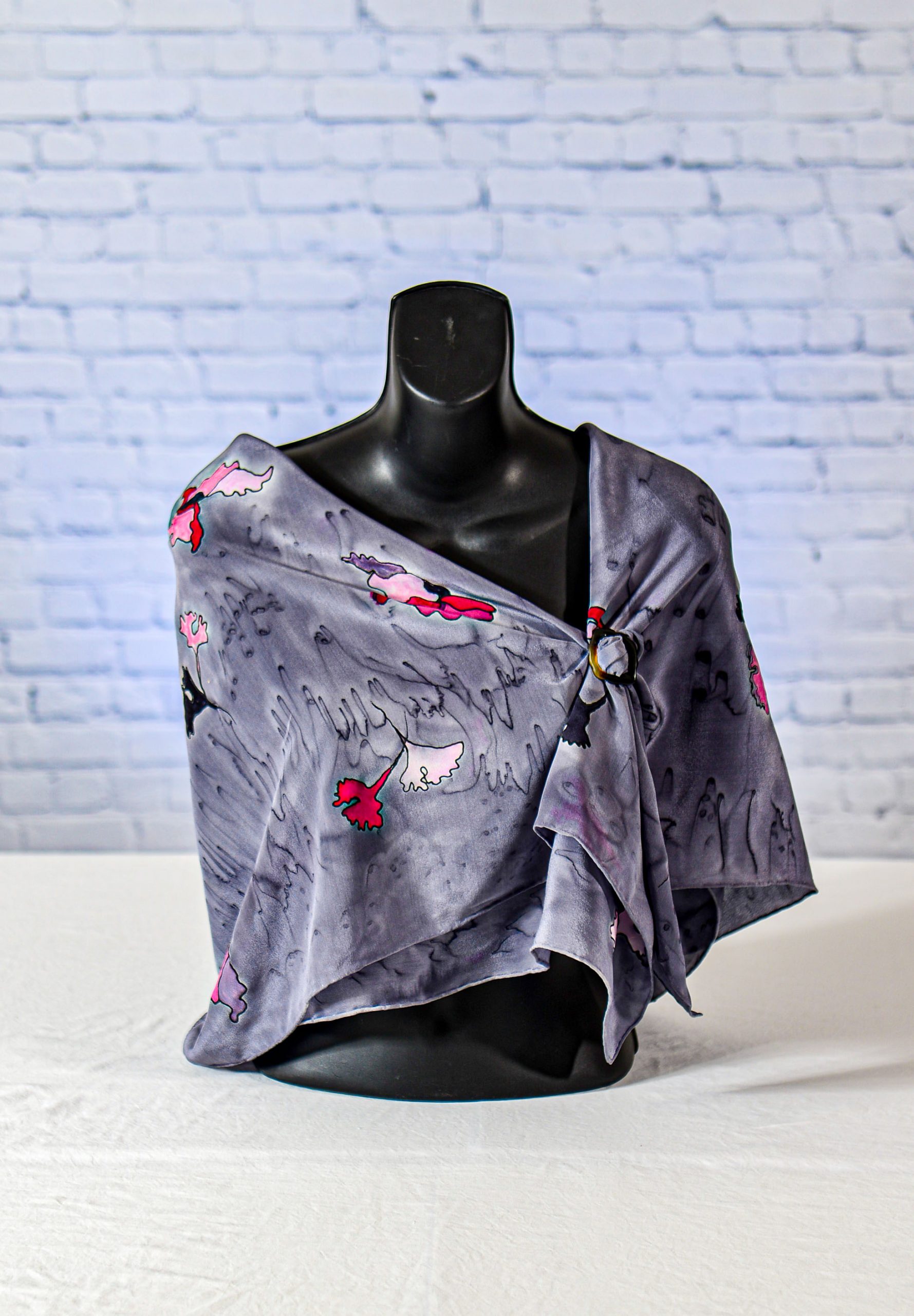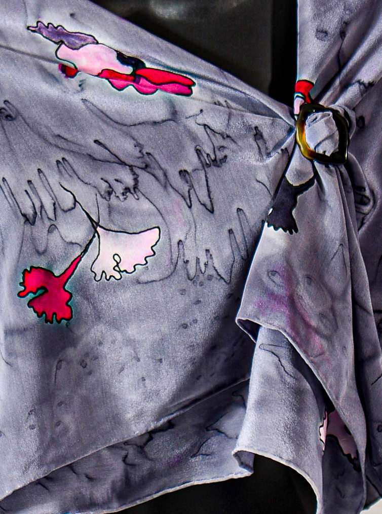 HAND PAINTED CREPE DE CHINE SILK SQUARE SCARF This scarf is made of the highest quality silk which gives it a beautiful drape whether you wear this as a scarf, shawl, or wrap. The Souri Gray and Parma Pink Silk Dyes pair perfectly with each other to feel the gentle falling of the lotus petals.
