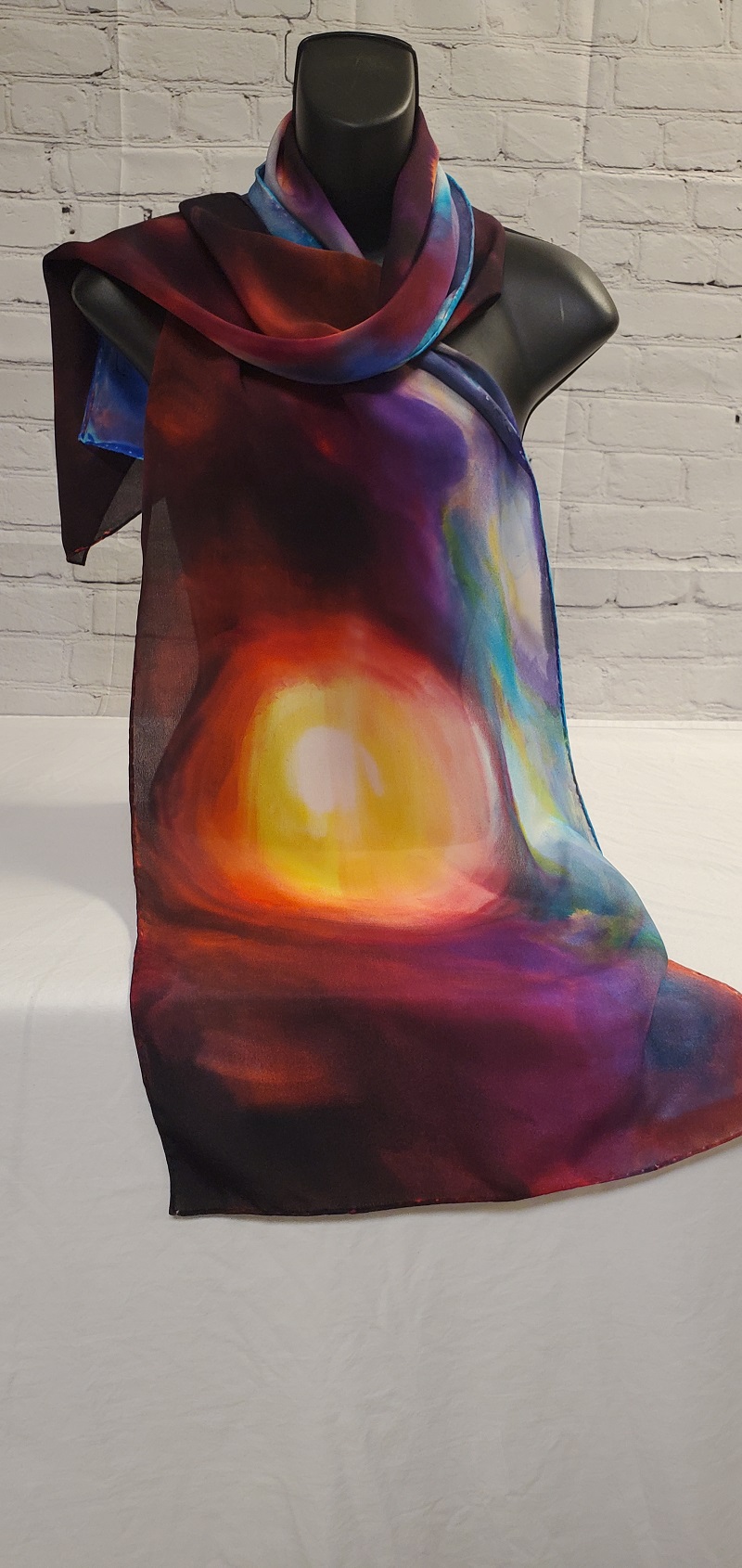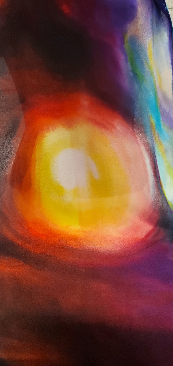 HAND PAINTED CREPE DE CHINE SILK SCARF PAINTED WITH FRENCH SILK DYES Reds, Yellows, and Purples thickened dyes were used to create this technique for the glowing orb design on this striking silk scarf.