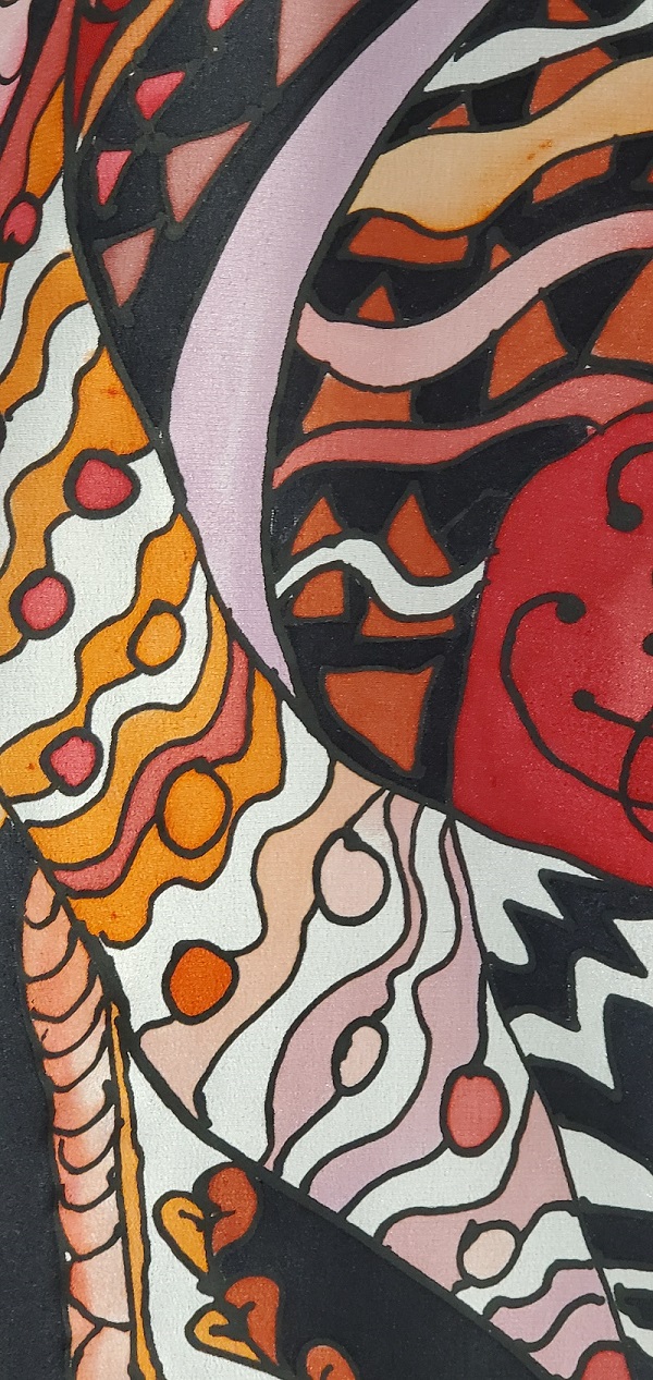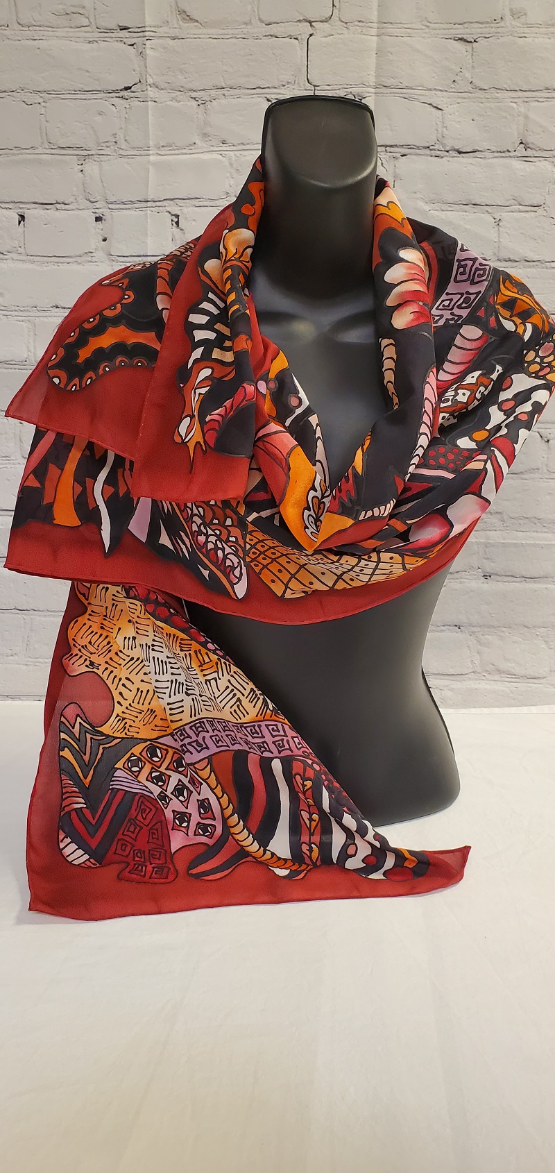 HAND-PAINTED SILK SCARF WITH RED, ORANGE, AND YELLOW ABSTRACT DESIGNS. This uniquely designed habotai silk scarf is a beautiful piece of wearable art, whether given as a unique gift or gifted to yourself.