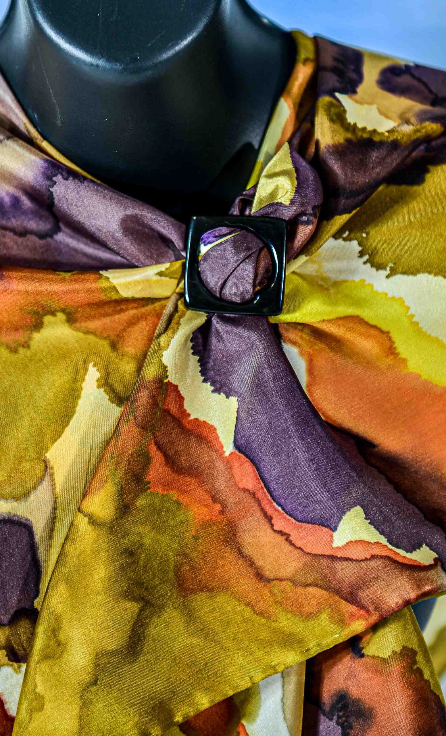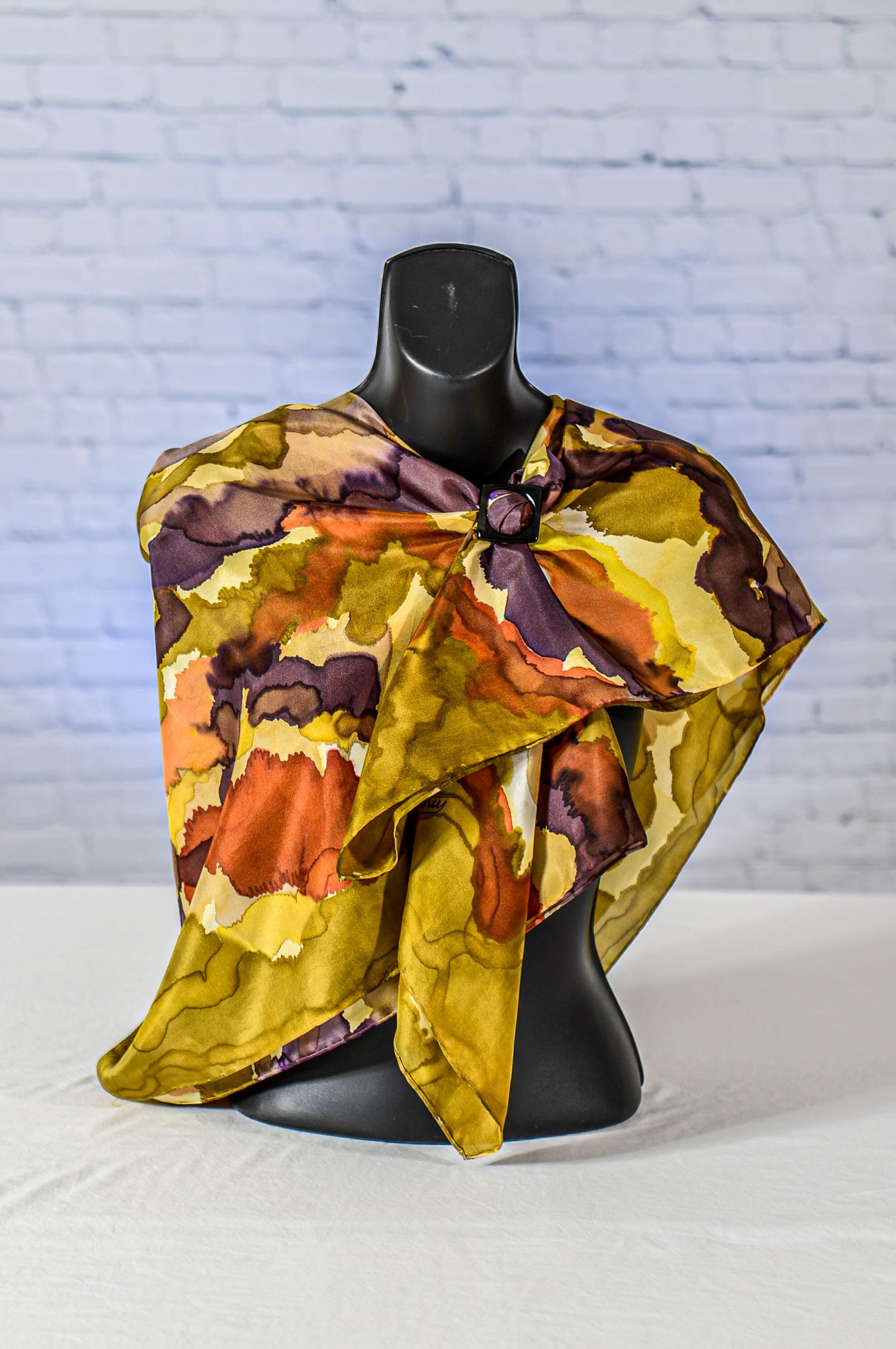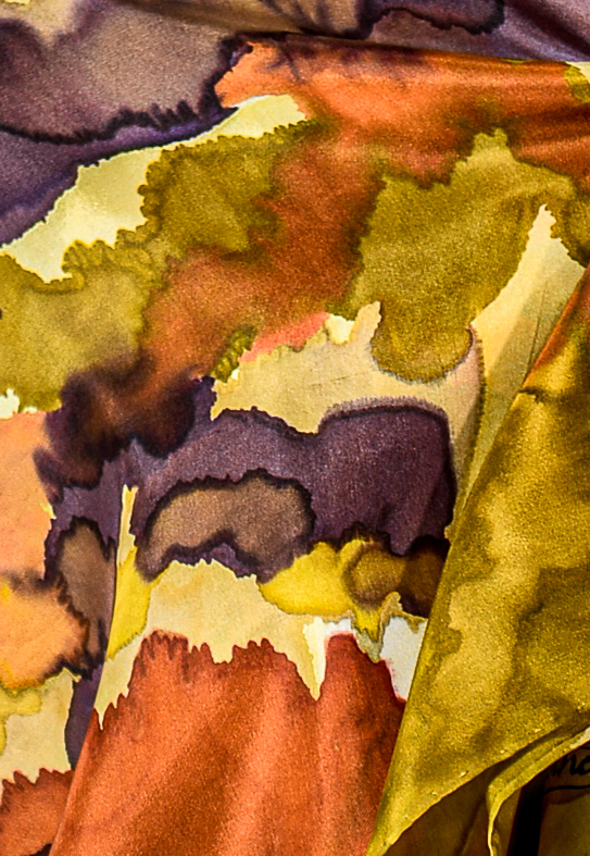 HAND PAINTED HABOTAI SILK SQUARE SCARF You can feel the winds swirling around with this Golden Brown, Beige Sable, Taupe, and Grapefruit Yellow French Dyes design. Soft and comfortable to wear, exciting to look at.