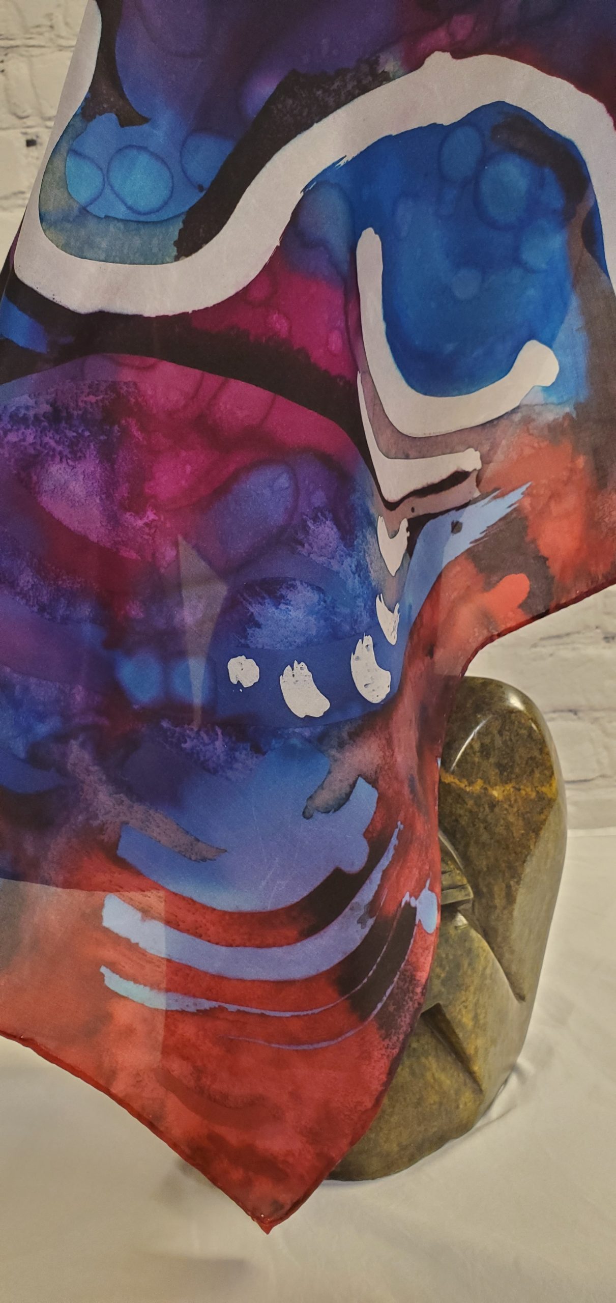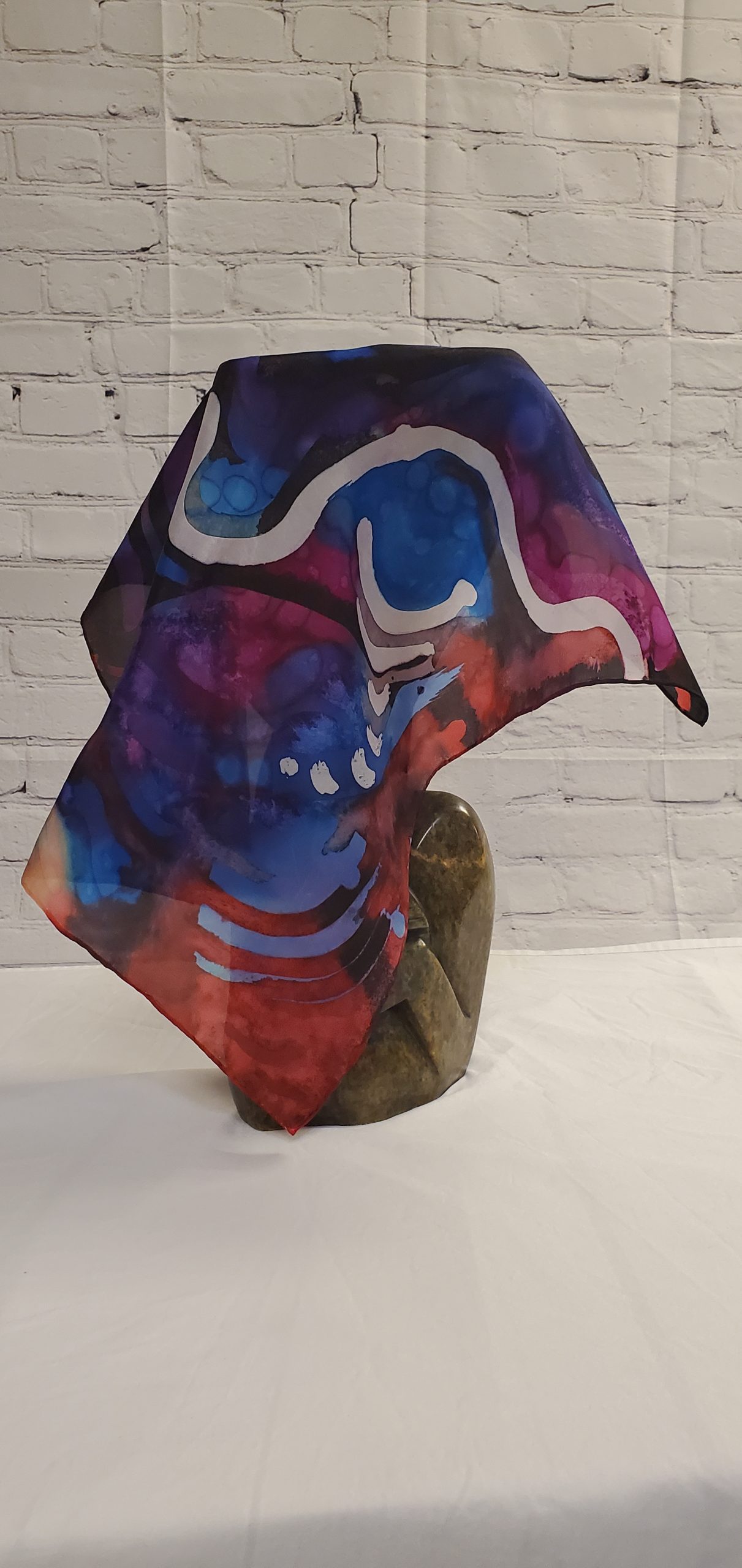 HAND-PAINTED HABOTAI SILK SCARF PAINTED WITH FRENCH SILK DYES You will love this versatile scarf for the mixture of colors and patterns that are a reminder of the flourishing beauty that exists in nature. The movement of the reds and whites, and blues gracefully meander through the design.